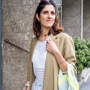 フレッシュでアクティブな服を自然体で着こなすマダム。「夫がいつも私に似合う服や宝石を見つけてくれます」。その夫が見立てたフォルテ フォルテのトップスとパンツ。オールホワイトのコーデに、地元のブレラ地区で買ったハンドクラフト小物を投入。