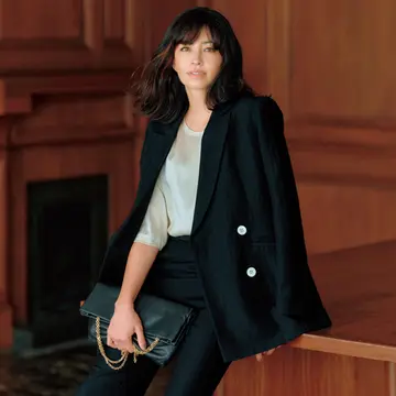 落ち着いた印象がありながら、スタイリッシュさもあきらめたくない、そんな人におすすめなのが、ダークブラウンのマスキュリンな表情のテーラードジャケット。ボクシーなシルエットは体のラインを拾いすぎず、袖にプレスが施されているため、腕まわりをほっそり見せる効果あり。麻混素材なので、シャリ感のある軽い着心地もうれしい。