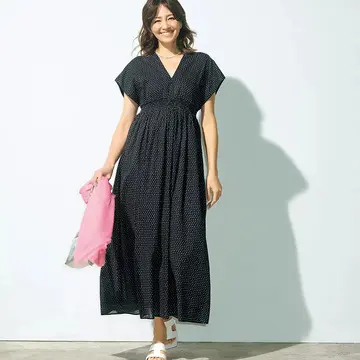 夏のドレスアップこそ、上品な肌見せで品よくラグジュアリーに。フロントのギャザー切り替えとバックのコクーンシルエット、少し落とした肩先。3つのこだわりディテールで、二の腕をカバーするブラックドレスは、フラワージャカード織りの優雅な素材感が特徴。