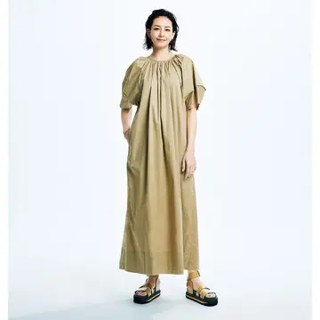 張り感のあるコットンツイル素材を使用することで、ふんわり袖やギャザーを寄せた襟もとなど、立体的なフォルムを実現したワンピース。クールなベージュが大人顔。