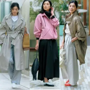 定番のトレンチ+デニムに迫力と華やぎを加えて