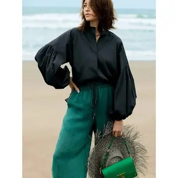 注目はウエスト位置の福耳のようなデザイン。「腕を後ろから包むようになるので、むき出し感が抑えられ、ウエストゴムの上でほどよくブラウジングします」。タイトめのスカート部との相乗効果で大人バランス。