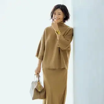 「ベージュ×ベージュは昔から大好きなマイ定番。“ベージュ同士は地味になる”という声も聞きますが、厚手のシャギーニット×薄手のサテンというふうに、上下の素材感のギャップを意識すればぐっとリッチに着映えます。私としては、サテンスカートのツヤ感、揺れ感が欠かせないポイントで、ほっこりしがちなウール素材のスカートは去年すべて手放したほど。また、ほんのり赤みのあるキャメルベージュは顔映りがよく、大人におすすめです」。