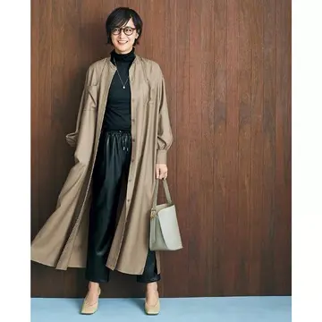 【スタイリスト 地曳いく子さんより】「たっぷりとボリュームのあるワンピースが欲しくて作った一着。特にこだわったのは生地で、コンサバになりすぎないように、梨地風のものを選んでいます。襟もとは前立てにボタンをつけた開閉できるデザイン。軽くてバランスがよく、肩で着られるワンピースなので、ワンサイズですがどんな体型のかたでも着こなせます。寒い季節にはハイネックのインナーとスパッツなどを合わせれば、かなり長く着られると思います。ベルトをプラスして変化をつけても。」
