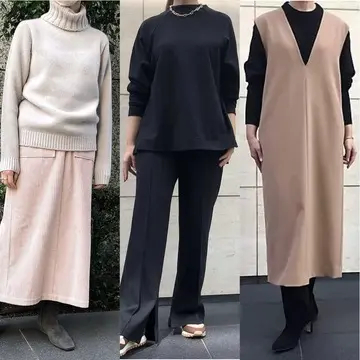 トップスは計算された素材とパターンで、きちんと感とラフ感を両立