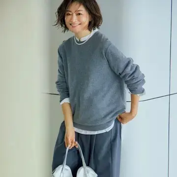 グレーはもともと端正でクールな色だから、ちょっぴり辛口に振るほうが持ち味が生きますよね。クルーネックニット×ワイドパンツのメンズライクな組み合わせなら、グレー同士でもキレのいい迫力が。パンツをニットより一段濃くして、グレーの濃淡をつけるときれいです。