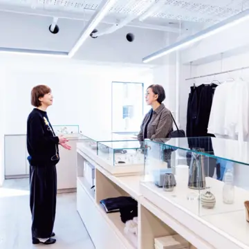 坪田さん絶賛のスタイリッシュな店内インテリア。ミリタリーパーカにランバンのロングジレを合わせるなど、大人の女性がまねしたくなるヴィンテージミックスを提案している