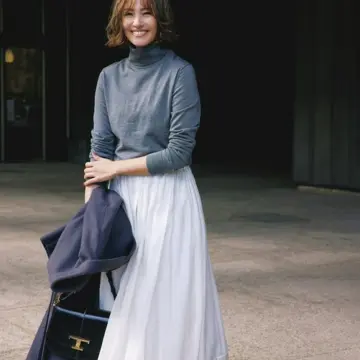 女らしさも気分も高揚させるツヤ質感は大人にこそ不可欠。ざっくりニットにほどよく厚みがあるダブルサテン素材のロングスカートを合わせて、冬コーデに抜け感をつくって。