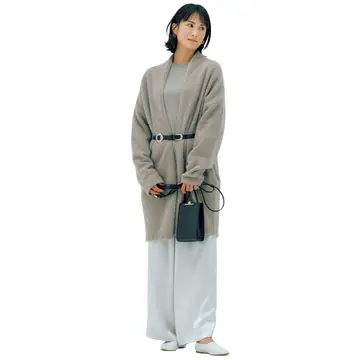 真冬の鉄板コーデ「ニット+パンツ」に、細ベルトを合わせてもっと素敵に! さっとひと巻きするだけでハイウエストパンツの脚長感を強調して、着映え感のあるバランスがかなう!