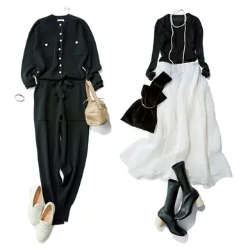 温泉とサウナを満喫し、おいしいものを食べるデトックス&リラックス旅。身支度はコンパクトに、が東原さん流。「基本、旅館にはなんでもそろっているので荷物は必要最小限。きれいめなニットセットアップを軸に、旅といってもふだんと変わらないテンションで。リラックスできるけれどカジュアルすぎないスタイルを心がけます」。