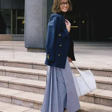 ニットやブルゾンといった上半身が重めの着こなしを、柔らかく軽やかな表情のプリントスカートでトーンアップ。