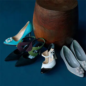 マノロ ブラニクの美しいフォルムの靴は、履くだけで気持ちも上がり、一点投入すれば理想の華やかさが手に入る。「ローヒールやミドルヒール、美しいローファーなどにも名品が多く目が離せません」(戸野塚)。