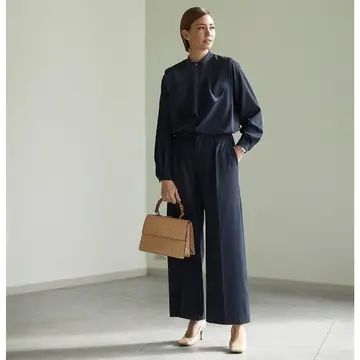 コットンとシルクのしなやかな光沢素材は、脚のラインにほどよく沿って華奢な印象に。「サイドポケットや腰と足首のギャザーが切れ味となって、ワイドなのにすっきり。ジャケットスタイルに抜け感を加えてくれます」。