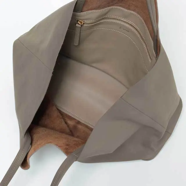 リュクスで女性らしい雰囲気のピンクベージュと、合わせる服の色を選ばない上品でシックなニュアンスのトープ。マチたっぷりの収納力&大きめ内ポケットつきで便利