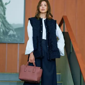 「これまで主流だったロング丈に比べ、身長を気にせず取り入れやすいのがショート丈ジレの魅力。ほかにも、ツイードやニットなど、素材のバリエーションが豊富なこと、短い丈で重心がアップして見えること、ボリュームスカートにも合わせやすいことなどうれしいポイントが。袖のないジャケットのような感覚でさらっとはおってみて。気軽なのにきちんと見えて、スタイルアップもかなうといいことずくめです」