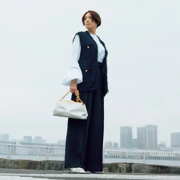 ジレ¥79,200・パンツ¥38,500/イレーヴ ブラウス¥53,900/シクラス ピアス¥61,600/エスケーパーズオンライン(ソフィー ブハイ) ネックレス¥198,000/ドゥロワー 二子玉川店(ノアーク フォー ドゥロワー) バッグ¥184,800/トッズ・ジャパン(トッズ) 靴¥46,200/アマン(アンスクリア)