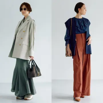 袖のないジャケットと呼びたくなる、大きめな襟とかっちりとしたシルエット。同素材のパンツとのセットアップコーデは、ほどよいきちんと感がありつつ、堅苦しくなりすぎずに大人のきれいめスタイルをアシストしてくれる。