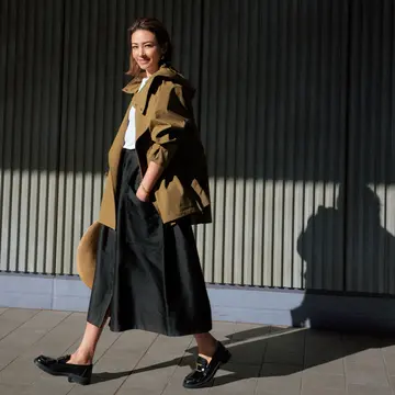 この春トレンドのボリュームスカート。ベーシックカラーやナイロンなどの軽やかな質感のスカートには、ボリュームのある厚底靴でメリハリを。今どき感たっぷりのバランスが生まれる。