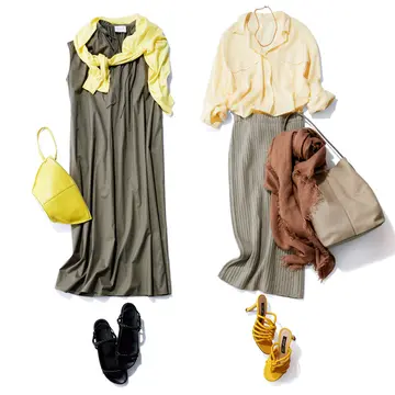 春らしく明るい色を着たいなら「イエロー」がおすすめ! 落ち着きのあるブラウンワンピースにビビットイエローを組み合わせれば、ベーシックな装いがたちまち新鮮に!