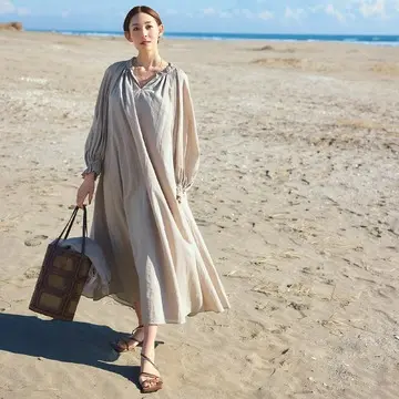 しなやかな質感の「リネン」に比べて、ハリコシがありしっかりしている「ラミー」。種類の違う麻素材を組み合わせて、夏らしいスタイリングを楽しんで。