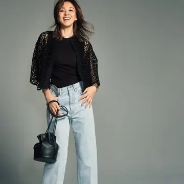 デニム¥29,700/アストラット 新宿店(アストラット) ジャケット¥48,400/モガ ニット¥25,300/ebure GINZA SIX店(ebure) サングラス¥46,200/モスコット トウキョウ(モスコット) 淡水パールピアス¥304,700・あこやパールネックレス¥377,300/TASAKI バッグ¥203,500/エリオポール代官山(ザンケッティ) 靴¥40,700/エストネーション(エストネーション)