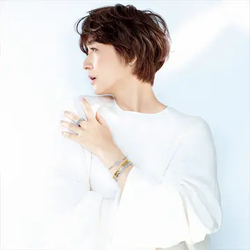 ラインが刻まれた存在感のあるシルバーバングルを、あえて長さを変えて両手につけ、シンプルなモノトーンの着こなしにインパクトを。ネックレスやリングなどはつけず、バングルのシャープな強さを思いきり堪能したい。
