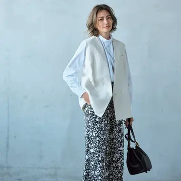 ジレ¥85,800・ブラウス¥33,000・スカート¥36,300/デパリエ ニュウマン新宿店(デパリエ) ピアス¥26,400/ブランイリス トーキョー(ブランイリス) ブレスレット¥16,500・リング¥13,200/ラッキーアンドカンパニー(アフェクト) 時計¥3,124,000/ジャガー・ルクルト バッグ¥841,500/フェンディ ジャパン(フェンディ)