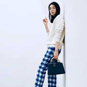 パンツ¥55,000・トップス¥37,400/ADORE ピアス¥49,500・ネックレス¥128,700/ジョージ ジェンセン ジャパン(ジョージ ジェンセン) バッグ¥503,800/デルヴォー・ジャパン(デルヴォー) 靴¥125,400/ブルーベル・ジャパン(マノロ ブラニク)
