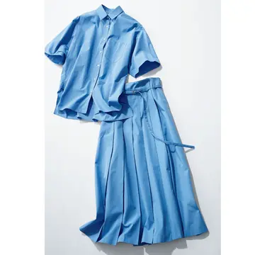 暑い夏は、できるだけ涼しく素敵に見えるおしゃれがしたい。そんなわがままにこたえてくれるのが「セットアップ」。華やかさや女性らしさを狙うなら、スカートタイプがベスト。シャツワンピース風の着こなしに見えるこちらのセットアップは、全身のシルエットまで美しく!