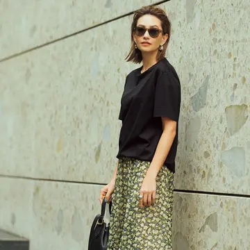 Tシャツ¥15,400/ボウルズ(ハイク) スカート¥35,200/エレメントルールカスタマーサービス(ブリル) ピアス¥23,100・ネックレス¥47,300・ブレスレット¥29,700/八木通商(ローラ ロンバルディ) バッグ¥272,800/リシュモン ジャパン セラピアン(セラピアン)