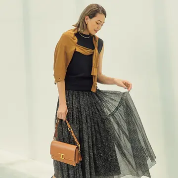 カーディガン¥41,800/イレーヴ タンクトップ¥15,400/エイトン青山(エイトン) パンツ¥29,700/エレメントルールカスタマーサービス(ブリル) ピアス¥55,000・バングル¥169,400/エスケーパーズオンライン(ソフィー ブハイ) バッグ¥169,400/J&M デヴィッドソン カスタマーセンター(J&Mデヴィッドソン)