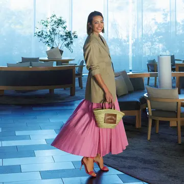 薄手のカーディガンは夏のおしゃれに欠かせないアイテム。スタイリストの村山佳世子さんが伝授する“こなれ映え”コーデであかぬけた印象に。明るいピンクのカーディガンを着くずすように使い、個性を演出。
