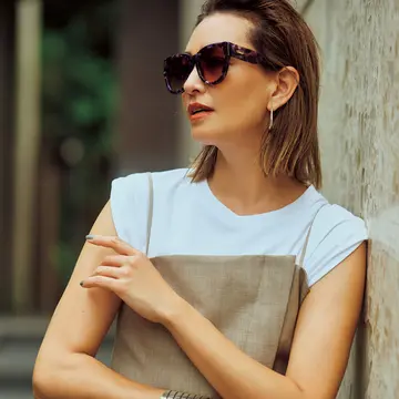 季節の変わり目は、キレよく印象を変えておしゃれを楽しみたい。スタイリストの村山佳世子さんがひとクセ小物を使った“切れ味映え”コーデを紹介。清涼感のある透明フレームのサングラスで、軽やかさを演出。