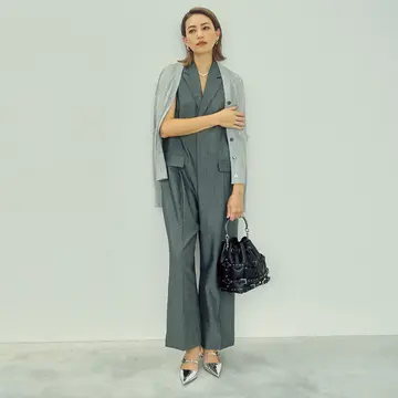 スタイリッシュなグレーのオールインワン。×黒だとモードに偏るところ、ブラウンとなら無機質なグレーに温度がプラスされエレガントな女性像になる。小物まで中間色で統一することで、柔らかな印象がいっそうきわだって。