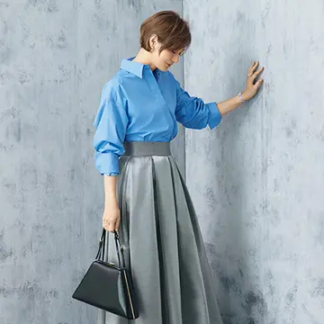 靴(5.5)¥151,800・バッグ¥495,000/プラダ クライアントサービス(プラダ) ジャケット¥165,000・ニット¥72,600・スカート¥132,000/ドゥロワー 二子玉川店(ドゥロワー) バングル¥1,320,000/ブチェラッティ ストッキング¥4,950/ステッラ(ピエールマントゥー)