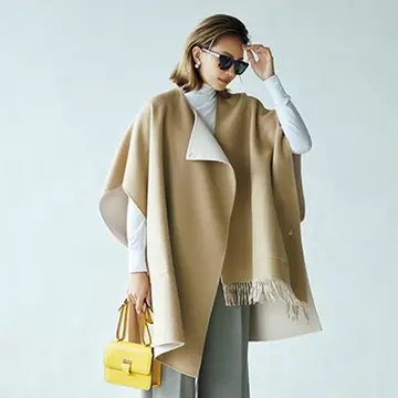 歩く姿や所作を優雅に見せてくれるケープコートは、大人を美しく見せる今季の注目デザイン。ミドル丈なら、ほどよい華やかさが楽しめる。