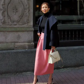 着るときれいな筒状になり、下半身のシルエットをすっきり整えてくれる。トレンドのマルチカラーツイードも、ブラウンベースの落ち着いた配色だから大人っぽく洗練ムード。短丈のシャツを合わせ、重心を上げてさらなるスタイルアップをねらって。