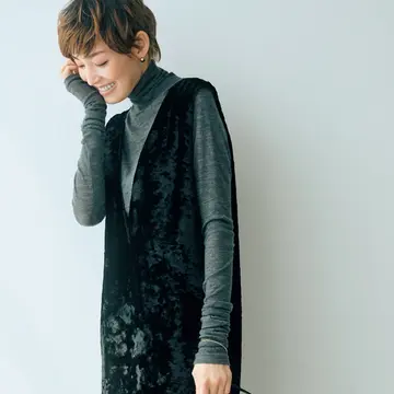 暗い色を選びがちなこの季節、明るめトーンを合わせて華やかに。軽やかな素材のキャミワンピースとタートルニットを使った大人の着こなしを、スタイリストの福田亜矢子さんがご紹介。