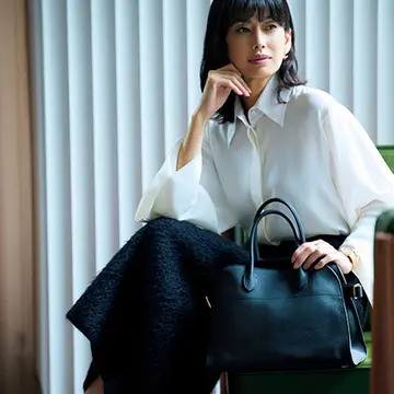 シンプルなエッセンシャルアイテムのムードを最大限に生かす小物使いとは?富岡さんが今夢中になっている「ザ・ロウ」のバッグをご紹介。