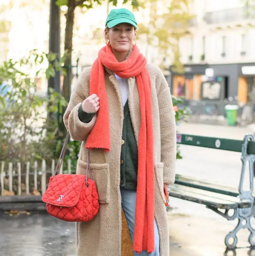 赤、ピンク、オレンジといった暖色系の色使いをポイントにしたおしゃれ上級者の着こなし。Ba&shの星柄のスカーフをラフに巻くことで、ピンクの千鳥格子のコートと絶妙にマッチ。キーカラーをグラデーション使いで取り入れることで、色や柄の遊びをシックにまとめることができる、という好例。