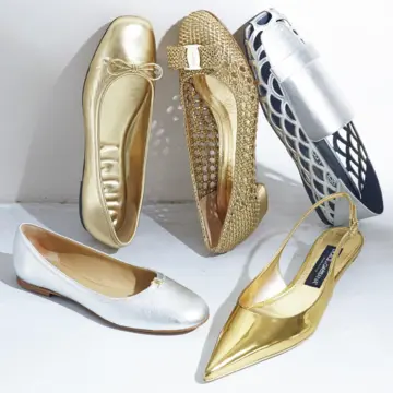 「強めの地金のジュエリーが若いころよりすっとなじむようになったと思いませんか? 年を重ねて素肌の質感がドライになると、ゴールドやシルバーがより映えるように。靴も同じ。大人こそメタリックの適齢期です! といっても高いヒールはNG。急に遊びがなくなりカジュアルに落ち着いてくれないから。フラットで、気負わず輝きを味方につけましょう」(戸野塚さん)。