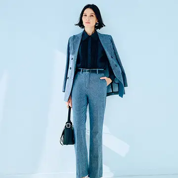 同素材のジレコートとのセットアップも楽しめるので、きちんと感をキープした脱・ジャケットスタイルにぴったり。キレのいいセンタープレスも美脚見えに貢献。