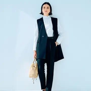 シンプルな黒のテーパードパンツも、少し幅広なウエストベルトとほんのりフォーマルなくるみボタンがアクセントに。中心寄りに設定した、計算されたフロントのタック位置のおかげでほっそり見えるのも見逃せない。腰位置がジャストウエストなので、よりマニッシュな雰囲気がきわだつ。