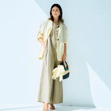 春トレンチも、深くリッチな赤みベージュでこれまでとは趣(おもむき)を変えて。ライトピンクのオールインワンにさらりとはおって、フェミニンな中にも今どきの迫力を備えた着こなしに。小物もベージュとピンクを微差のトーンで重ね、色を生かした完成度の高いおしゃれを目ざしたい。