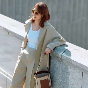 コート¥119,900・パンツ¥48,400/マッキントッシュ ギンザシックス店(マッキントッシュ) ニット¥29,700/ザ ショップ スローン 新静岡セノバ店(スローン) サングラス¥47,300/アイヴァン 東京ギャラリー(アイヴァン) ネックレス¥264,000/エスケーパーズオンライン(ソフィー ブハイ) バッグ¥424,600/トッズ・ジャパン(トッズ) 靴¥46,200/アマン(ペリーコ サニー)