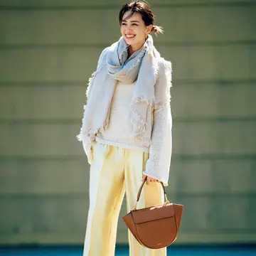 清涼感のある白と組み合わせると、ゴールドのツイードスカートが柔らかく、軽やかな表情に