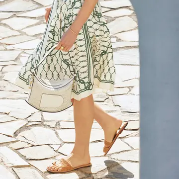 「ヒール靴へのハードルが高いエクラ世代に朗報なのが、超フラットタイプのサンダルトレンド。カジュアル感が強くなるので、デザインのどこかにエレガントなアクセントがあるものを選べば大人でもしっくりくるはず(戸野塚さん)。」