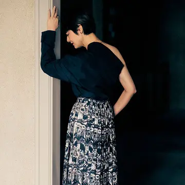 エッフェル塔のぼかしプリントが施された、パリ気分満載のスカートを主役に。クリーンな白シャツが、スタイリングをモダンでフレッシュに見せるポイント。シンプルなブラック&ホワイトの着こなしほど、アクセサリー使いはもちろん、着る人のアティチュードが映し出され、センスを物語る。