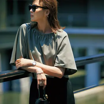 ドライな女らしさを生む「カーキ」が、夏のワンツーコーデに今っぽいコントラストをプラス。構築的な腰高デザインのパンツを取り入れて、モダンにこなれる!
