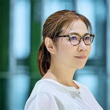 「きれいめにまとまりがちなシンプルな黒のコーディネートも、このメガネがあるだけで一気にこなれて、華やかに。自分では選べないようなデザインも、ここでは骨格に合うものを適切に見つけてもらえるので安心して挑戦できます。メイクを変えるより簡単で効果的にイメージを一新できるんです」。
